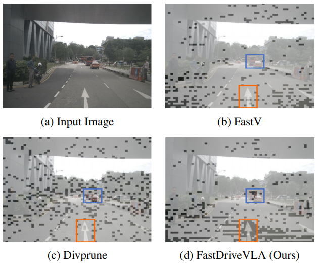 可视化结果可以清晰地表明,本文提出的方法更好地保留了车道区域,并有效地关注了车道标志和车辆。相比之下,FastV倾向于忽略车辆,而Divprune保留了更多更分散的token,但对车道区域的关注有限。