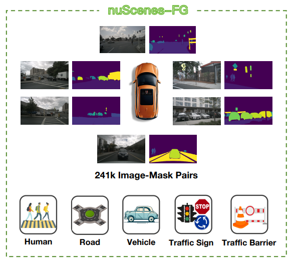 本文受到人类驾驶行为的启发,将自动驾驶场景中的前景区域定义为包含行人、道路、车辆、交通标志和交通障碍物的区域。同时采用Grounded-SAM在nuScenes场景中生成一致且细粒度的前景分割标注。由此产生的nuScenes-FG 数据集包含来自六个摄像机视角的241k个图像-掩码对,示例如图1所示。