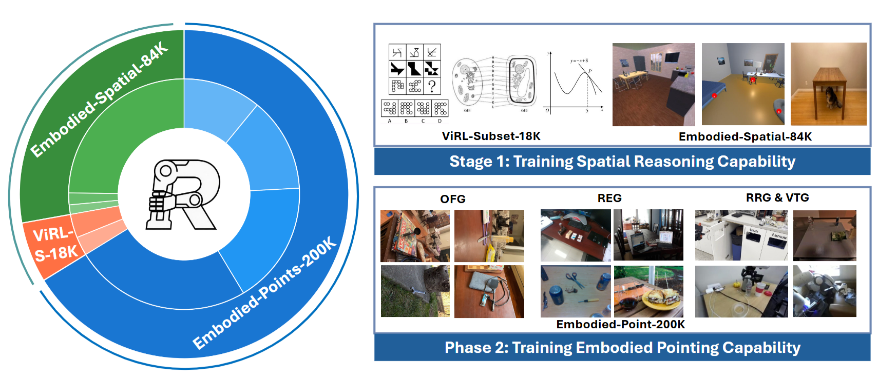 图3|训练数据概览: 在第一阶段,重点提升模型的空间推理能力,同时加入少量通用推理数据。第二阶段则训练模型的具身指点能力,涵盖四个不同的子能力