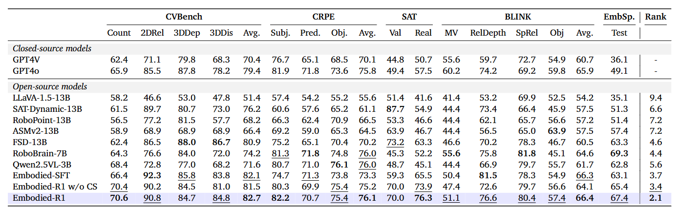 ● Embodied-R1 在所有开源模型中表现最佳,平均排名 2.1;