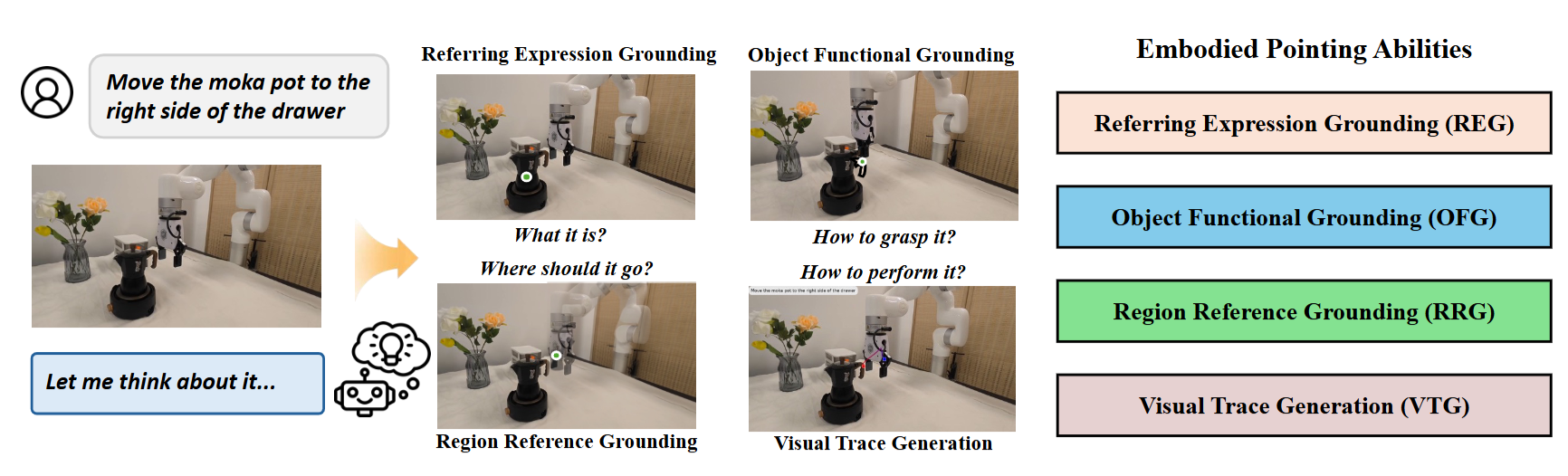 来自天津大学的团队提出了 Embodied-R1,一个专为机器人推理与操作设计的 30 亿参数模型。它引入了一个非常直观的中间表示——“指点”(pointing),并围绕这一表示定义了四种关键能力:指代表达理解(REG)、空间区域指点(RRG)、功能部位指点(OFG)、视觉轨迹生成(VTG)。通过这种方式,模型能够把复杂的视觉语言理解转化为通用、可迁移的操作指令。