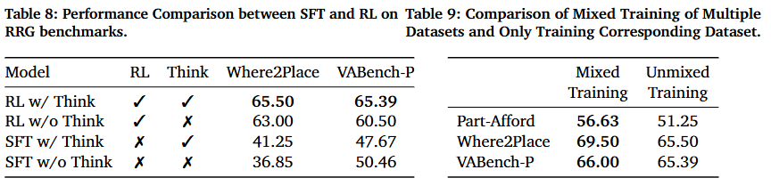 图8|Table8展示了RFT vs SFT的对比效果;Table 9 展示了消融混合训练模块的对比结果