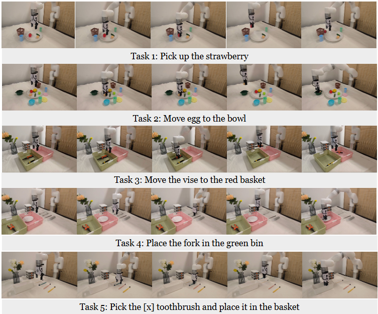 图7|真实机器人实验结果(展示前5个任务的可视化及综合的定量实验数据)