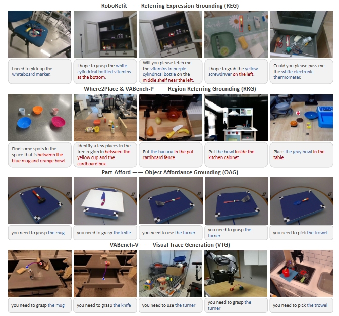 ● 空间区域指点(RRG):理解相对空间关系,输出合适的空白区域坐标,例如“放在碗和杯子之间”。