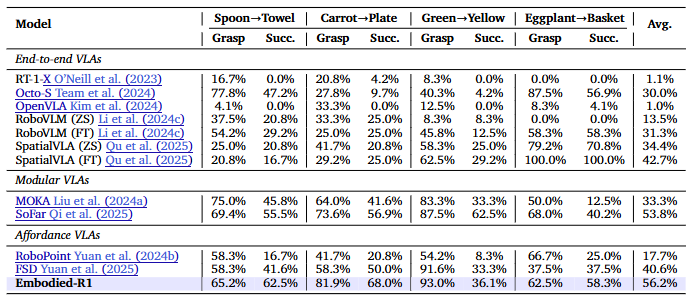 在四大能力(REG、RRG、OFG、VTG)上,Embodied-R1 同样展现出优势: