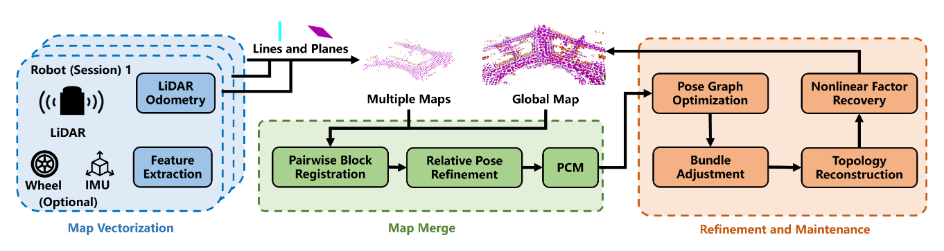 图3|SLIM框架总览:先把原始点云提炼成更轻的“线”和“面”,再把不同时间采的地图合成一张全局图。随后用 PGO(位姿图优化) 和 BA(束调整) 做平滑与校正;通过以地图为中心的边缘化,即便长期多次采集,计算与存储也不会爆炸,适合城市级长期建图