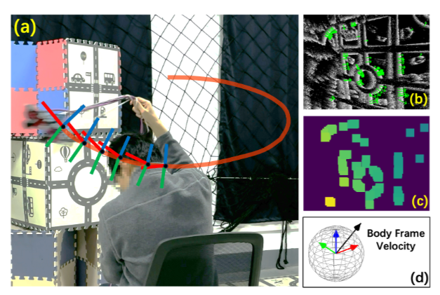 图8|系统用双目事件流 + IMU 推出当下线速度:(a) 通过水平旋转制造高速运动;(b) 事件数据估计法向流(稀疏、异步);(c) 在法向流起点估计稀疏深度;(d) 得到机体系下的瞬时线速度示意