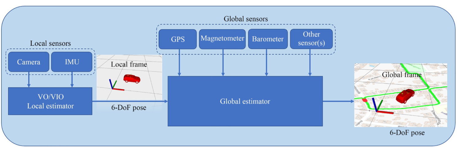 图1|框架示意:先用相机/IMU等得到短时精确轨迹,再引入GPS等全局信息作锚定;通过统一的图优化把两者对齐并消除漂移,最终获得全局一致的位姿
