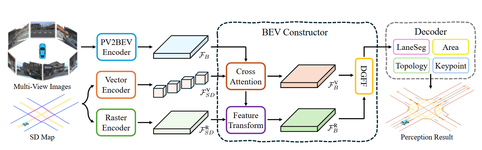 图5|SEPT系统总览:把 SD 地图中的道路/路口先验,引入并与鸟瞰特征(BEV)融合,同时做错位校正;在不依赖昂贵高精地图的前提下,提升远距与遮挡场景的识别与拓扑关系推断效果