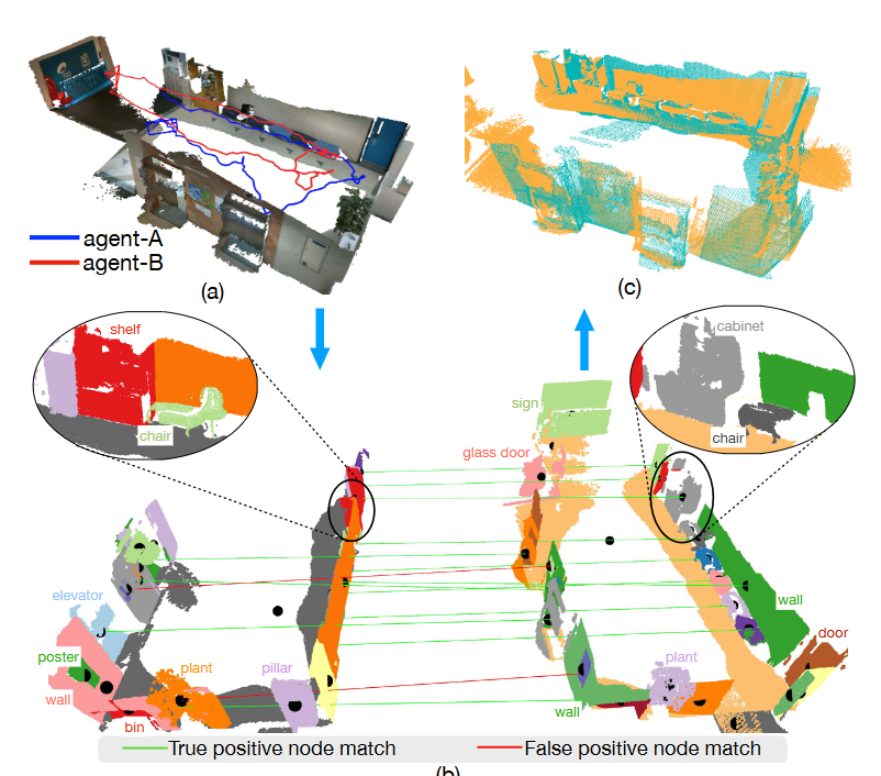 图6|两机器人 SLAM 的语义场景图对齐:相向采集的 RGB-D 跨视角匹配节点并估计变换,最终把两张图对齐成一张统一地图