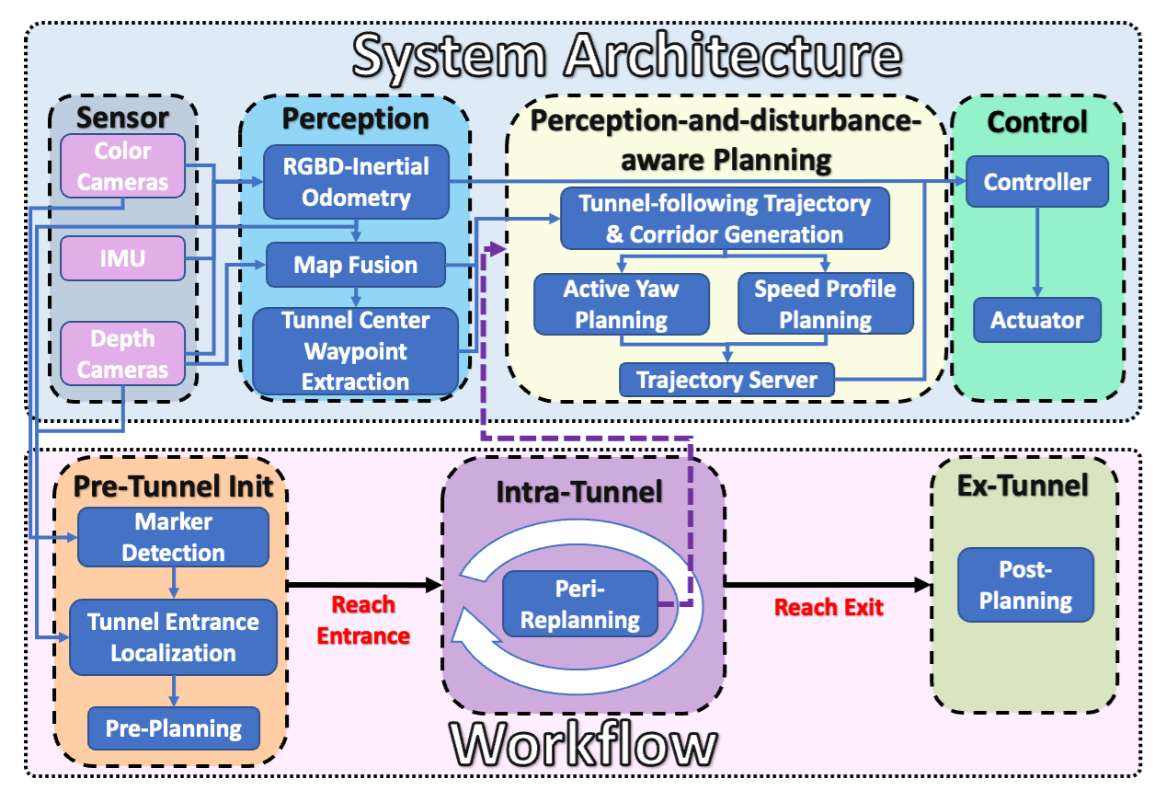 图2|系统设计总览:相机彩色/深度图和 IMU 输出运动估计并融合成地图;从地图抽取“中心线”航点,考虑可见性与自体气流扰动来生成轨迹(位置、偏航、速度),最后转成电机控制。流程:入隧定位与预规划 → 隧内持续重规划 → 出隧后收尾规划
