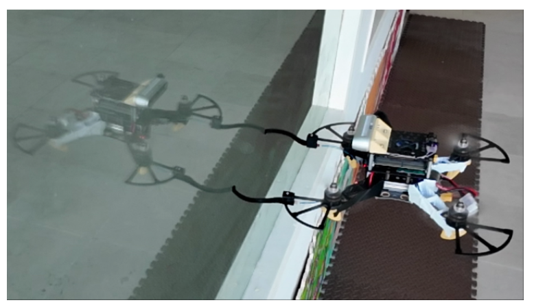 图4|当视觉判定前方可能是玻璃时,无人机主动前探,用机头两枚触觉传感器轻触表面进行存在性确认;确认无误后再进入后续避障流程
