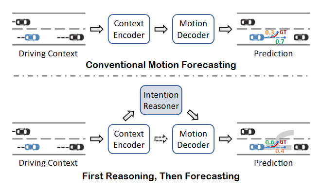 图9|上:用感知特征直接回归未来轨迹。下:先基于场景关系推断目标车意图(可选虚线步骤),再生成带概率的多条轨迹,更稳健也更可解释