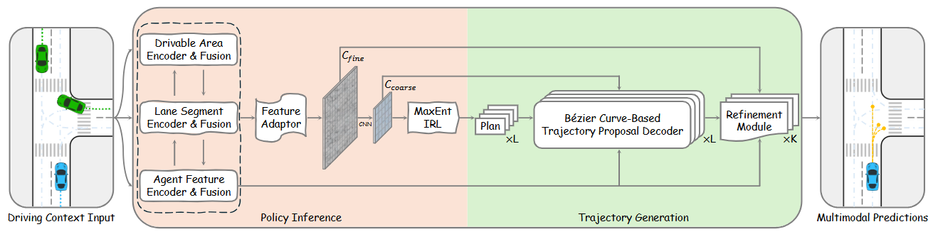 这项研究把轨迹预测从“直接回归未来”改成“先推理、后预测”:先用基于 IRL 的可解释意图推理器(query-centric IRL)把场景里的车辆与道路要素编码到统一向量表示中,聚合上下文后得到奖励分布,以此推断出多种可能意图作为先验;再用分层解码器(DETR 风格)结合双向状态空间模块生成带概率的未来轨迹。在 Argoverse 与 nuScenes 上显著提升置信度与性能,为路口博弈、遮挡等不确定场景提供了更可解释且易与规划对接的预测路径.