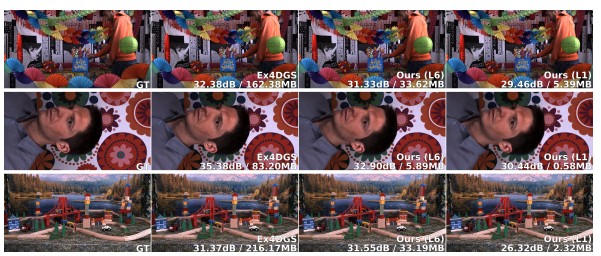 图3|重建结果对比,可以看到应用提出的框架之后,可以将4DGS的重建大小进行极大地压缩(216.17MB VS 2.32MB)但是精度上的损失极小