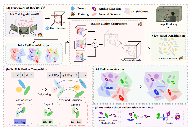 图1|ReCon-GS 框架流程。(a) 首帧先生成高质量的高斯渲染(3DGS)表示,并用基于网格的最远点采样嵌入到自适应分层的运动表示中;(b) 通过显式运动合成,在后续帧上持续更新这份基座 3DGS;(c)(d) 定期执行层级重构,用层内形变继承来应对复杂物体运动,同时保持时间一致性;最后再做基于视角的点密度加密(densification),进一步细化,得到高质量渲染