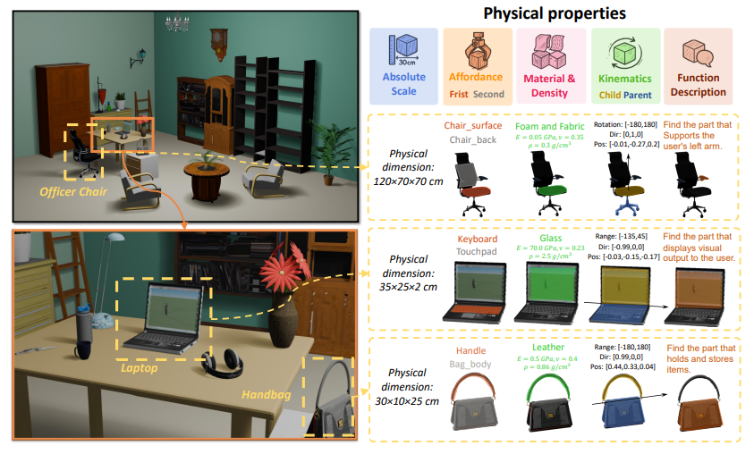 ● 构建首个物理标注的 3D 数据集(五维:绝对尺度、材质、可供性、运动学、功能描述),基于 VLM 的人机协同完成规模化标注;