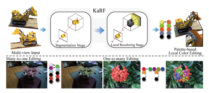 图10|该图展示了 KaRF 方法的整体流程与编辑效果。方法基于KANS构建了包含分割阶段与局部重着色阶段的两阶段辐射场框架,通过弱监督方式实现三维场景任意区域的高保真色彩编辑。上半部分展示了模型从多视角输入到分割与局部重着色,再到基于调色板的色彩自适应编辑的完整流程;下半部分展示了多对一与一对多的编辑结果,体现了 KaRF 在保持几何一致性的同时实现灵活多样的外观修改能力