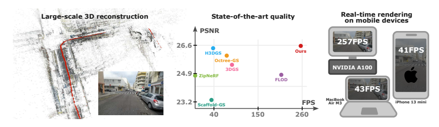 效果(文中报告):在室外(Hierarchical 3DGS)与室内(Zip-NeRF)基准上取得高质量、更低延迟与更低内存占用,可在内存受限设备上实时渲染。