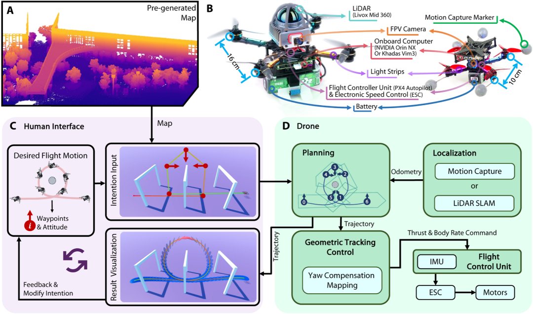 推荐理由: 这篇论文开创性地提出了一个完整的系统,使四旋翼无人机能够在遍布密集障碍物的复杂环境中,自主生成并执行专业飞手级别的复杂特技飞行动作。该研究通过引入一种全新的特技飞行意图通用表示方法,结合时空联合优化的轨迹规划器,不仅解决了特技飞行中任意姿态组合的难题,还巧妙地规避了差分平坦奇点导致的动力学问题。最终,通过在真实世界中与顶尖人类飞手的直接对比测试,该系统展现了卓越的稳定性与更高的成功率,将无人机的自主飞行能力推向了新的高度。