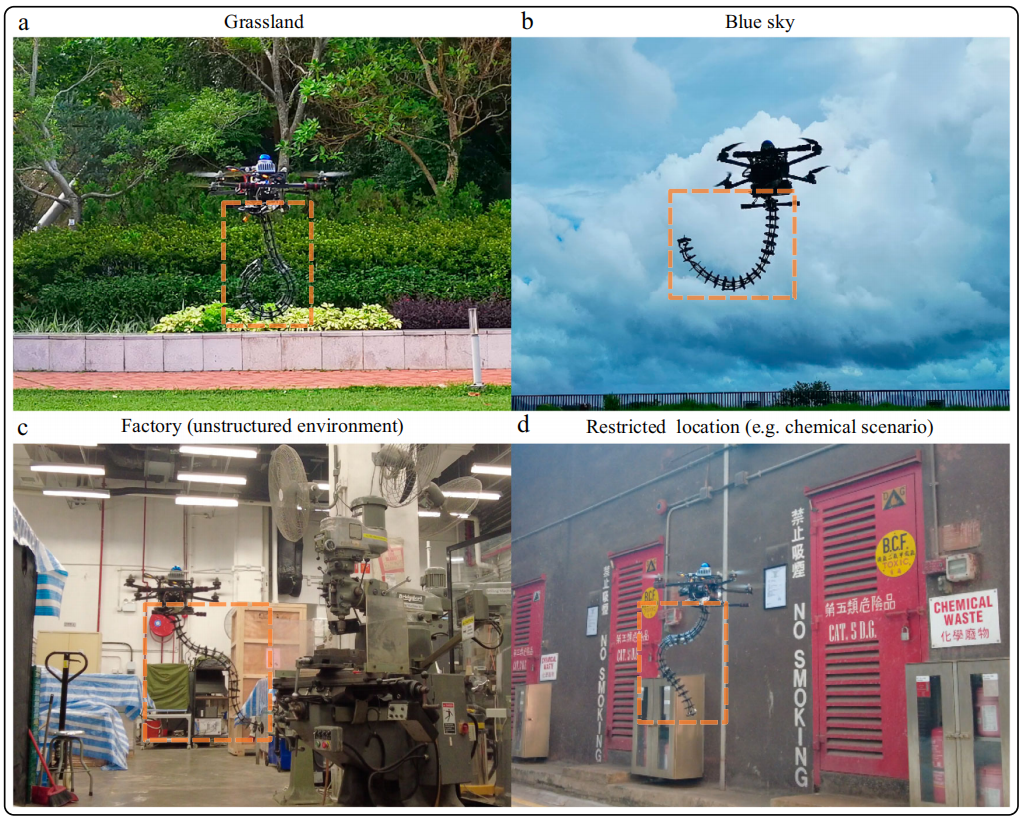推荐理由: 论文提出了一种名为“空中象鼻”(Aerial Elephant Trunk, AET)的新型高柔顺性、高灵巧度空中连续体操控器,成功解决了传统刚性臂空中机器人普遍存在的灵巧度与有效载荷之间的矛盾。 通过将一个轻量化四旋翼无人机与一个灵巧的三段式连续体臂相结合,并为其设计了创新的紧凑型驱动系统,该系统显著降低了电机数量与机械臂惯性,同时有效防止了肌腱松弛问题。该研究通过大量真实世界的实验,验证了AET在管道、缝隙等狭窄受限空间中的卓越导航能力,以及对不规则形状物体的独特缠绕抓取能力,为空中机器人在复杂、非结构化环境下的实际应用(如高空检修、灾后搜救等)树立了新的技术标杆。