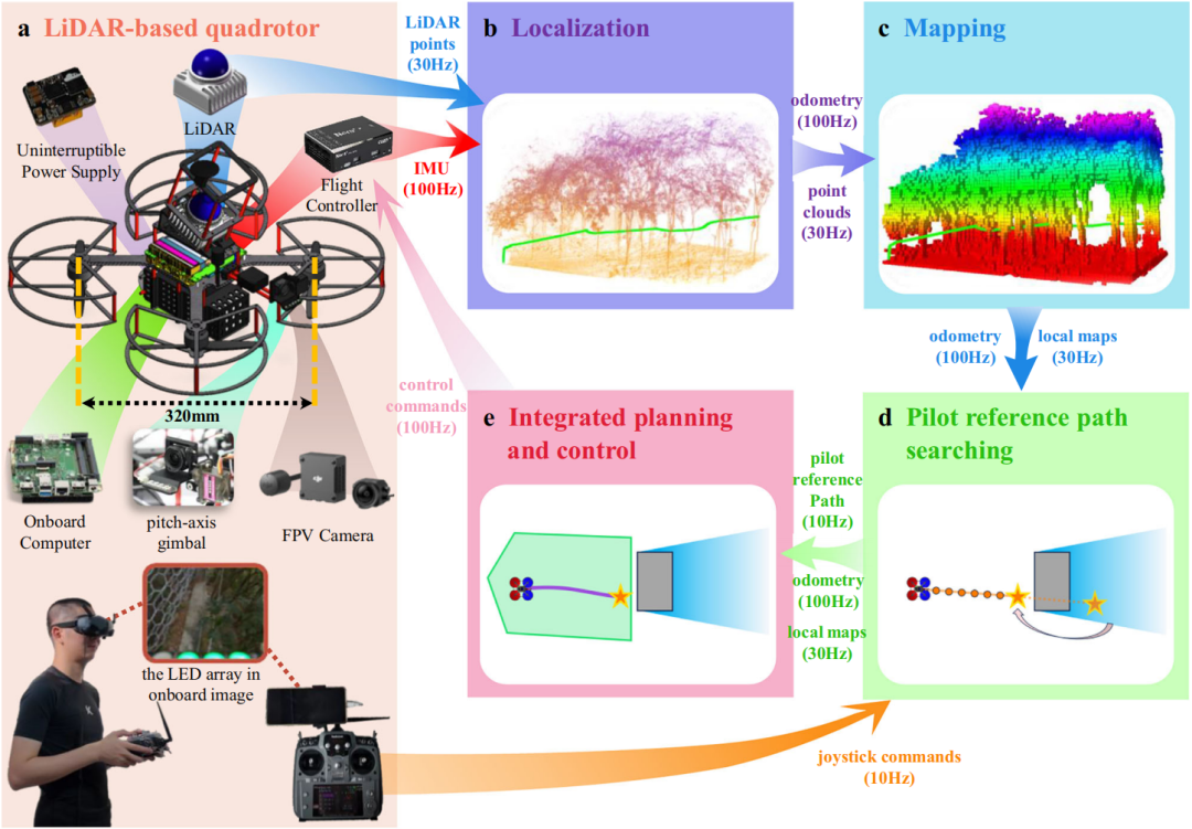 论文内容:为解决山体滑坡防治工程中(如柔性拦石网)的巡检难题,研究人员开发了一款搭载激光雷达的四旋翼无人机系统,专门应对茂密植被覆盖下的陡峭斜坡环境。 该系统采用“人在回路”的操作模式,飞行员通过遥控器下达高级飞行方向指令,而无人机则利用其自主导航系统实时进行路径规划与障碍物规避,使操作员能专注于巡检任务本身。 系统的核心是一套综合性软件框架,包括用于GPS拒止环境下精确定位的激光雷达-惯性里程计(FAST-LIO2),一个能构建高分辨率地图并精确识别树枝等细小障碍物的建图模块(增强型ROG-Map),以及一个集成的规划与控制(IPC)模块,确保无人机能够敏捷响应并抵抗阵风等外部干扰。 研究团队在香港的六处真实斜坡上进行了实地部署测试,成功完成了对柔性拦石网的近距离视觉检查任务 ,并在与先进的商用无人机DJI Mavic 3的基准测试中,展示了其在感知和穿越复杂环境方面更强的鲁棒性和安全性。