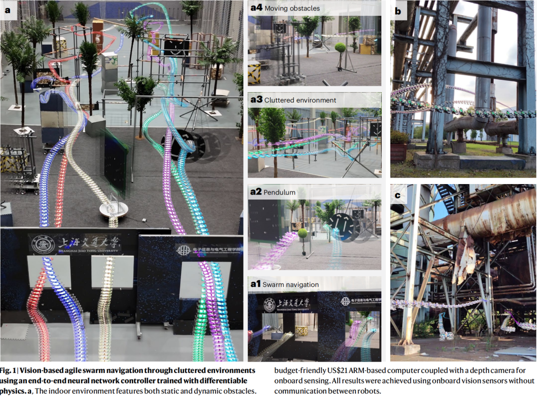 推荐理由: 论文首次提出了一种通过可微分物理仿真进行端到端训练的颠覆性方法,成功实现了无人机群在未知复杂环境中的高速敏捷飞行。该系统无需无人机之间的通信或中央规划,便可展现出等待、跟随、避碰等自组织群体智能行为。尤为突出的是,该成果在仅售21美元的超低成本计算平台(仅为现有方案成本的5%)上实现了高达20米/秒的飞行速度,是此前模仿学习方案的两倍,为资源受限环境下可大规模部署的廉价、高效无人机群应用树立了新的里程碑。
