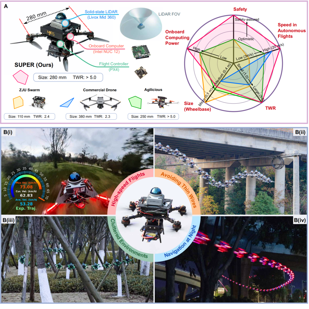 论文内容:作者提出了一款名为SUPER的安全高速空中机器人,旨在解决微型飞行器在未知环境中实现高速自主飞行的系统性挑战 。 该系统集成了高推重比(大于5.0)的紧凑型机身与轻量化的三维激光雷达(LIDAR),以实现敏捷的机动性和远距离精确的障碍物感知能力 。 为同时保证飞行速度与安全性,研究人员设计了一种高效的规划框架,该框架直接利用LIDAR点云数据,在每个重新规划周期内生成两条轨迹:一条完全位于已知自由空间以确保安全,另一条则探索未知空间以最大化速度 。 通过对映射和轨迹优化模块的重新设计,该框架的计算效率得到极大提升 。 大量的真实世界测试验证了该系统的性能,SUPER成功地在森林等非结构化环境中以超过20米/秒的速度飞行,能够规避细小的树枝和电线,并在包括夜间在内的各种光照条件下保持稳健表现,展示了其在搜救、灾害响应等时间敏感型任务中的巨大应用潜力 。