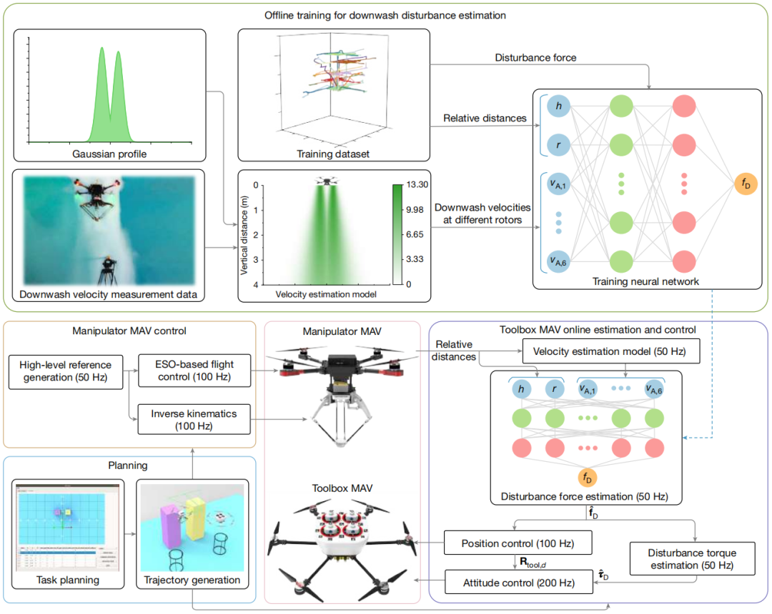论文内容:作者提出了一个名为“Flying Toolbox”的协同空中操作系统,该系统由一个携带多种工具的“工具箱无人机”(toolbox MAV)和一个配备了delta机械臂的“操作无人机”(manipulator MAV)组成。核心目标是让操作无人机能在工具箱无人机的正上方近距离飞行,并自主完成工具的取放与更换,以执行复杂的连续性任务。为解决垂直堆叠飞行时上方无人机产生的强烈下洗气流对下方无人机的严重干扰问题,研究团队设计了三大核心模块:一是集成了电磁铁和弹性系绳的柔顺对接机构,以确保在存在姿态误差和物理冲击时也能成功对接 ;二是基于高斯剖面和神经网络的下洗气流扰动估计与补偿方法,该方法能在线实时估计扰动力和力矩,并前馈到控制器中进行抵消 ;三是高精度的对接与操控技术,以满足亚厘米级的对接要求。实验结果表明,该系统在20次连续对接测试中实现了0.80 ± 0.33 cm的平均对接精度,并成功完成了自主切换剪刀和夹爪以剪断绳索、搬运物体的多阶段复杂任务,验证了该系统在强气动耦合干扰下的高精度、高鲁棒性和多功能性。