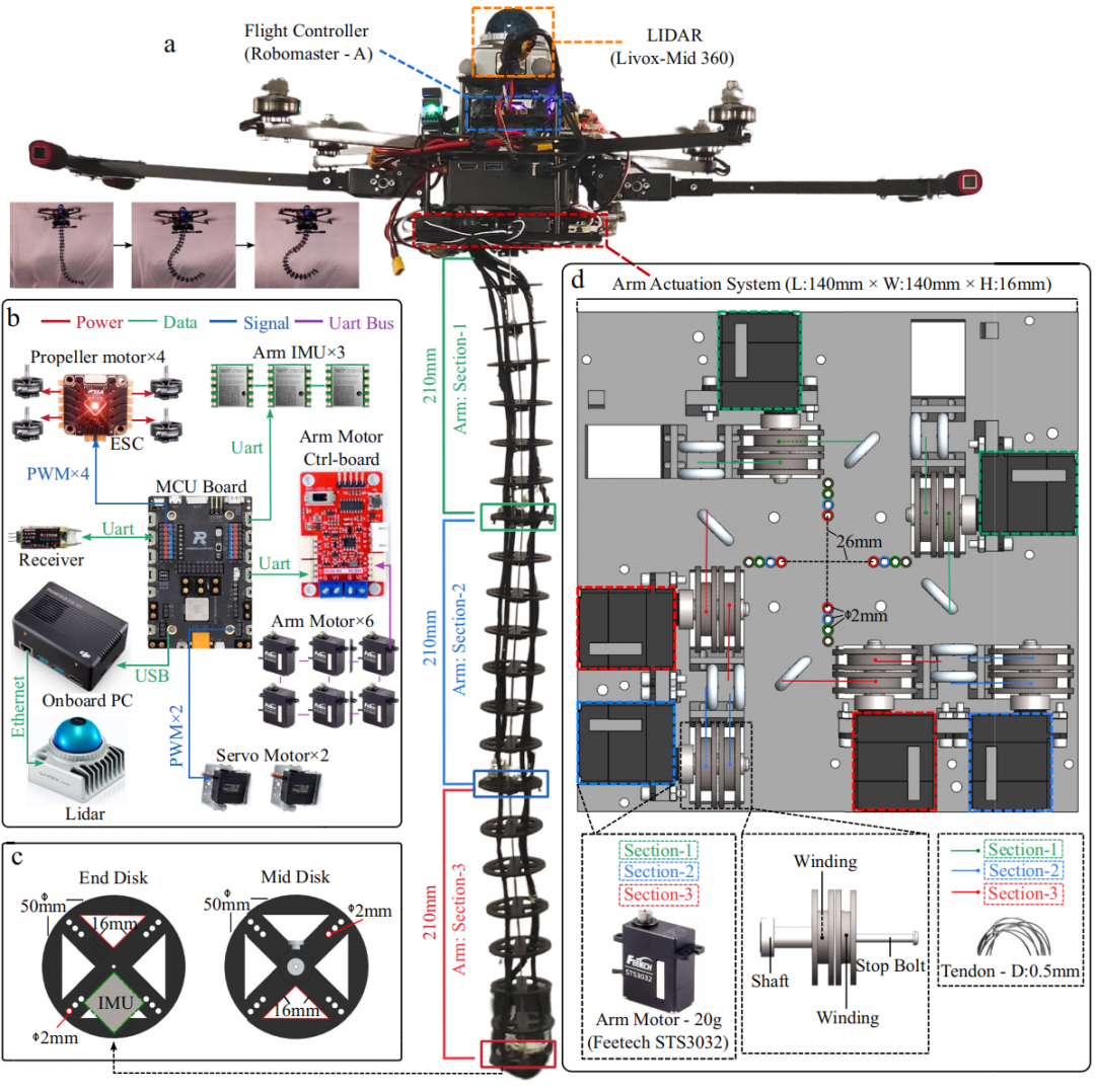 论文内容:该论文介绍了一款受象鼻启发的、名为AET的空中连续体操控器,旨在解决现有空中机械臂在复杂环境中操作的局限性。 该系统由一个小型四旋翼无人机平台和一个三段式、肌腱驱动的连续体机械臂构成,其核心创新之一是设计了一个高度紧凑的驱动系统,将所有电机水平集成于一个平面,并通过让每个电机驱动一对对角线肌腱的方式,将驱动三段臂所需的电机数量减至六个,有效减轻了系统重量并抑制了肌腱松弛。 研究团队为AET开发了一套完整的软硬件系统,包括无人机状态估计、基于分段常曲率的机械臂形状估计、逆运动学模型求解以及多层级的飞行与机械臂协同控制器 。 通过全面的实验验证,AET展示了其基础运动性能、模型精度以及在复杂任务中的卓越能力,例如成功穿越L形、C形和S形的弯曲管道,在有障碍物的狭窄缝隙和孔洞中完成抓取任务,并利用整个臂体缠绕并运输了多种不同重量、尺寸和形状的物体。 最后,论文还展示了基于全身运动规划的自主空中轨迹跟踪能力,成功完成了空中书写字母和穿越圆环等高级任务,证明了AET作为下一代空中作业平台的巨大潜力。
