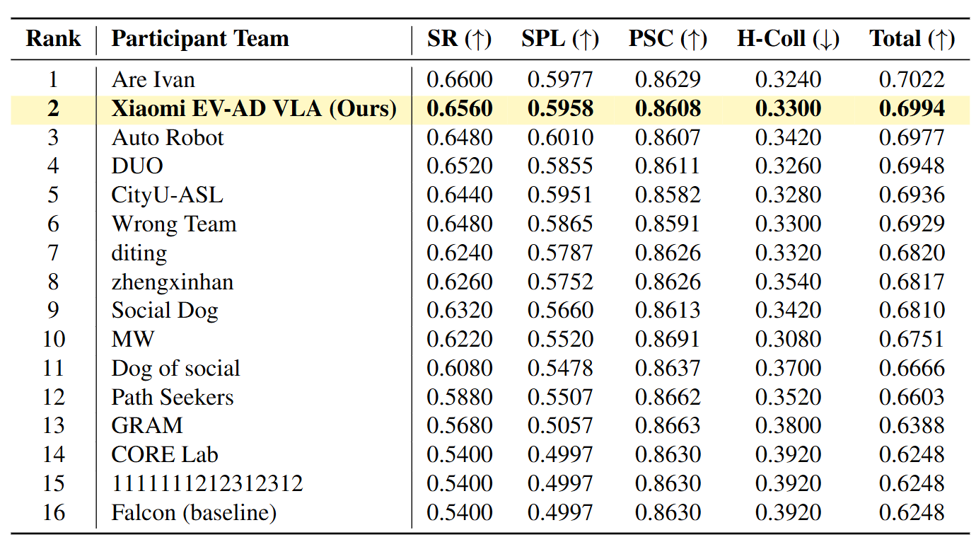 图4|表格展示了 IROS 2025 RoboSense Challenge 社会导航赛道的最终成绩。官方基线方法为 Falcon,我们的团队 Xiaomi EV-AD VLA 在 16 支参赛队伍中获得第 2 名,总得分为 0.6994,仅比冠军低 0.0028