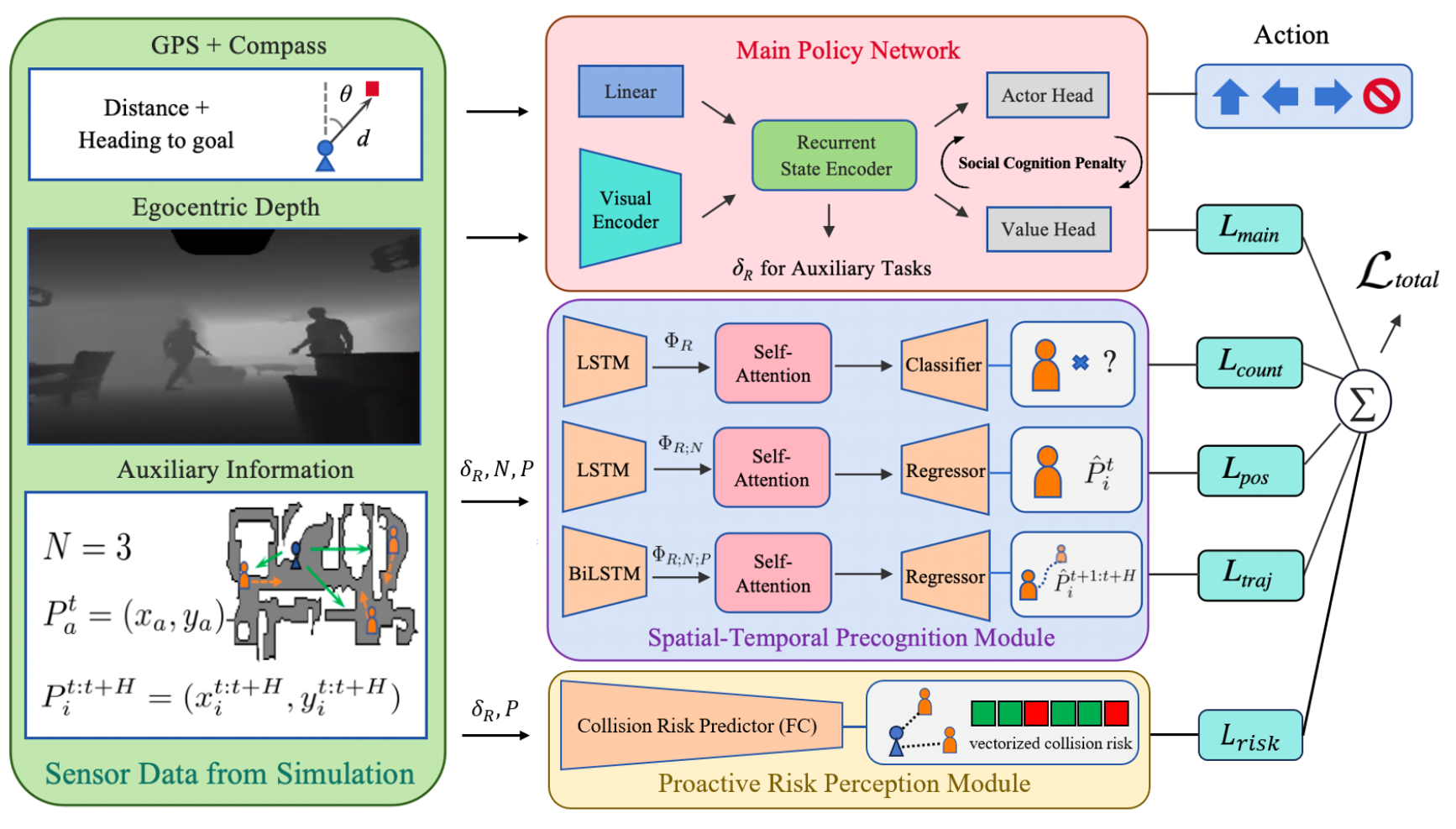 图2|方法总览:这张图概述了论文提出的方法。团队在 Falcon 框架的基础上新增了一个主动风险感知模块(Proactive Risk Perception Module),该模块与主策略网络并行运行,输入为深度图与定位信息(GPS + Compass)。策略网络在训练过程中受到社会认知惩罚(Social Cognition Penalties)的约束,输出特征同时送入 Falcon 的“时空前瞻模块(Spatial-Temporal Precognition Module)”与主动风险模块。风险模块会根据人与机器的距离预测潜在的碰撞风险,为每个附近行人生成一个连续风险值,并通过辅助损失信号(auxiliary loss)提升智能体的空间感知与避碰能力。简而言之,它让机器人在学习路径规划的同时,也学会“感受危险”