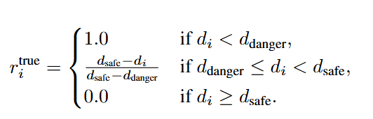 图3|论文中对于危险区域的划分公式:危险的得分从0开始逐渐增加到1,在论文中采用2m表示危险区的临界值,4m作为安全区距离的临界值