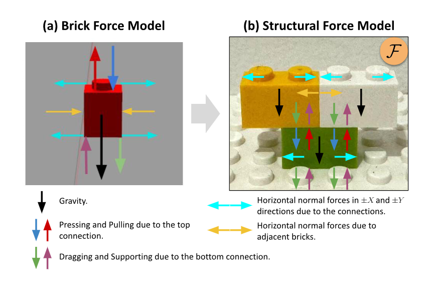 图4|这张图解释了物理稳定性如何计算。(a) 左图展示单个积木受到的各种力:包括重力(黑)、上下砖块的垂直力(红/蓝、绿/紫)、连接处的剪切力(青)以及相邻砖块的侧向支撑力(黄);(b) 右图将这些力扩展到整体结构,形成完整的受力网络。通过求解静力平衡方程,系统能为每块砖打出“稳定性分数”,决定它是否可能坍塌