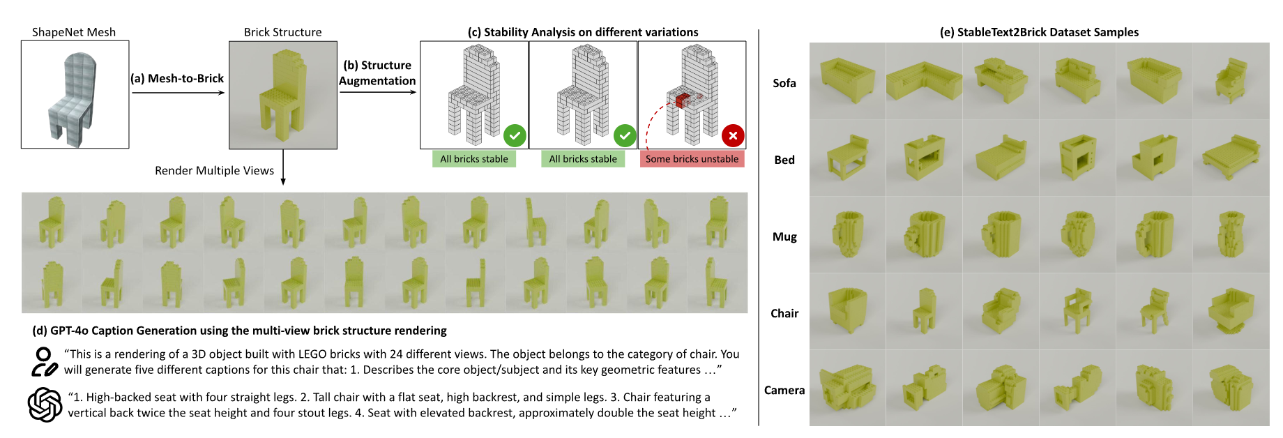 图5|这张图揭示了他们如何构建“教AI搭积木”的数据集。(a) 研究者先从 ShapeNetCore 的3D模型出发,将其体素化为 20×20×20 的网格,再通过“删—重建”算法生成砖块结构;(b) 为增加多样性,每个形状会随机调整砖块布局;(c) 然后利用物理稳定性分析过滤掉不稳的结构,只保留能“立得住”的;(d) 最后用 GPT-4o 从24个视角的渲染图生成详细文字描述;(e) 下方展示了来自五个类别的样例数据。这套流程让模型学会把几何形状与文字描述对齐,也为后续的物理可建造性打下基础