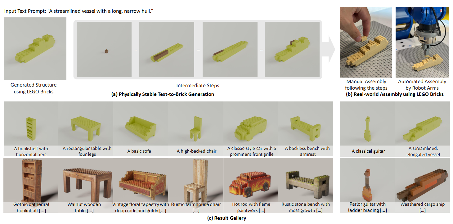 图1|这张图展示了 BRICKGPT 的整体工作流程。(a) 系统从一句自然语言描述出发,逐块生成可拼接、物理稳定的积木结构,每一步都能看到“砖块接砖块”的搭建过程;(b) 生成的设计既能手动拼装,也能由双机械臂自动完成搭建;(c) 下方展示了不同类型的生成结果——不仅有基础结构(上方),还能根据外观描述生成带颜色和纹理的模型(下方)。官方网站还提供了逐步搭建的视频演示,强烈推荐一看(https://avalovelace1.github.io/BrickGPT/)