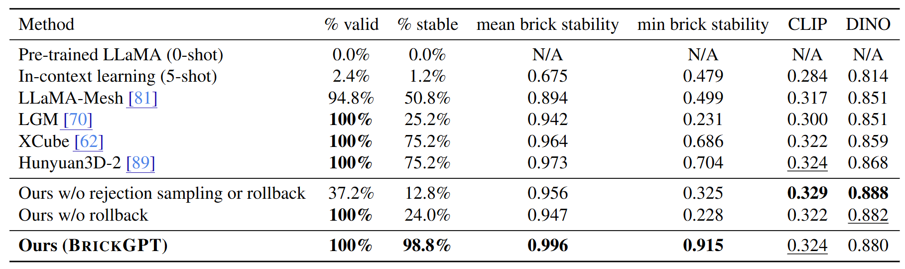图6|各模型在多项指标上的表现:有效率(Validity):BRICKGPT 达到 100%;稳定率(Stability):高达 98.8%,远超其它方法(LLaMA-Mesh 仅 50.8%);CLIP/DINOv2 相似度:保持与输入文字高度匹配的视觉一致性。这得益于论文提出的“砖块拒绝采样”和“物理回滚”机制,使模型在不牺牲美观的情况下保持结构稳固