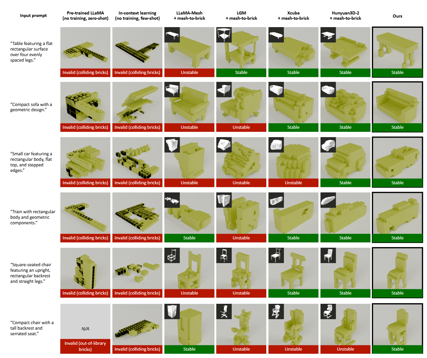 得益于这套机制,BRICKGPT 生成的结果中,98.8% 的结构物理稳定,远超 LLaMA-Mesh 的 50.8% 或 XCube 的 75.2%。