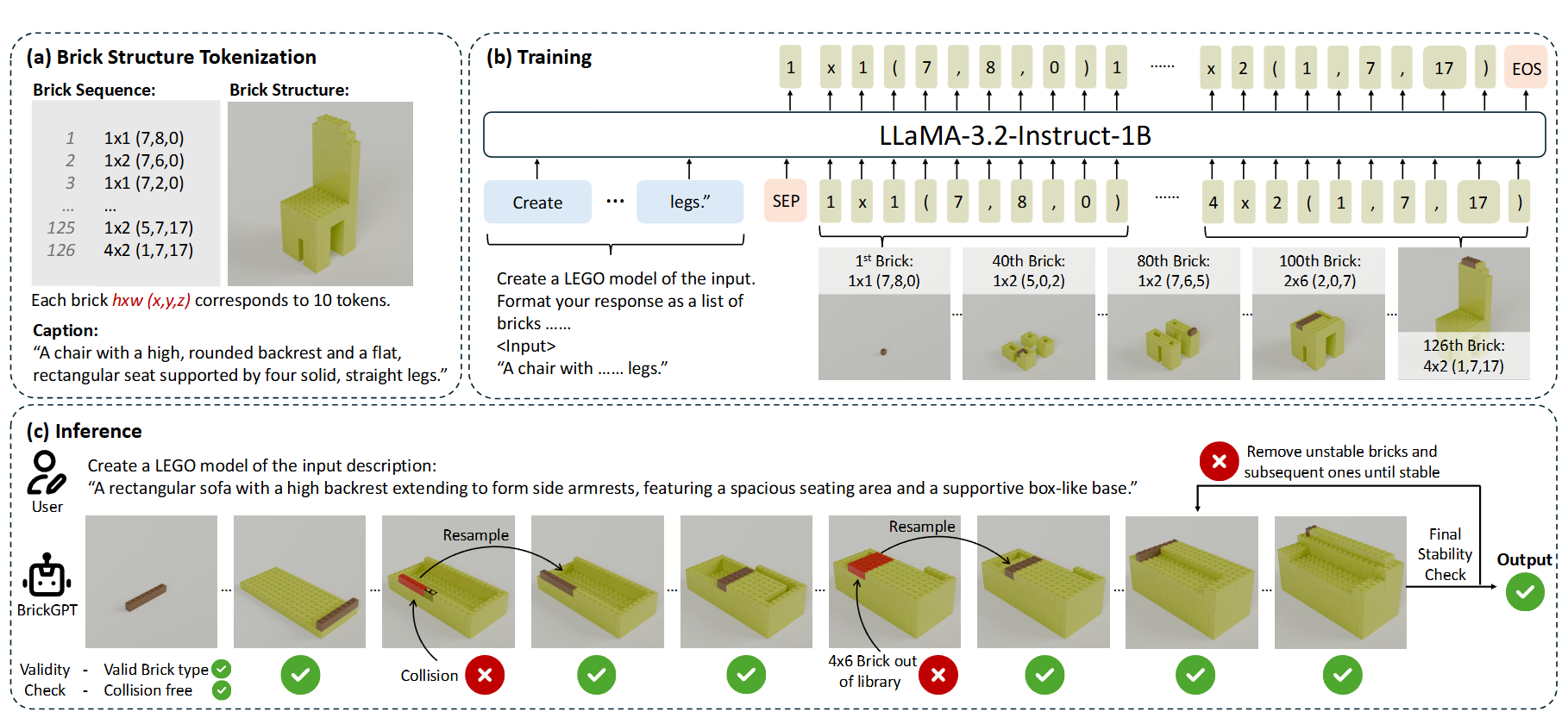 图3|展示了 BRICKGPT 的核心原理。(a) 首先,把一个完整的积木结构拆解成“文本化砖块序列”,就像一句话被拆成词;(b) 接着,团队用这些“砖块-描述”对,微调了 LLaMA-3.2-1B 模型,让它学会从文字中“写出”积木;(c) 在推理阶段,系统会逐块生成,每新增一块都要通过有效性检查(是否来自标准库、是否重叠)。如果检测到不稳定,就会触发物理回滚机制——删掉问题砖块重新生成,直到结构完全稳定。可以理解为:模型在“边搭边自检”