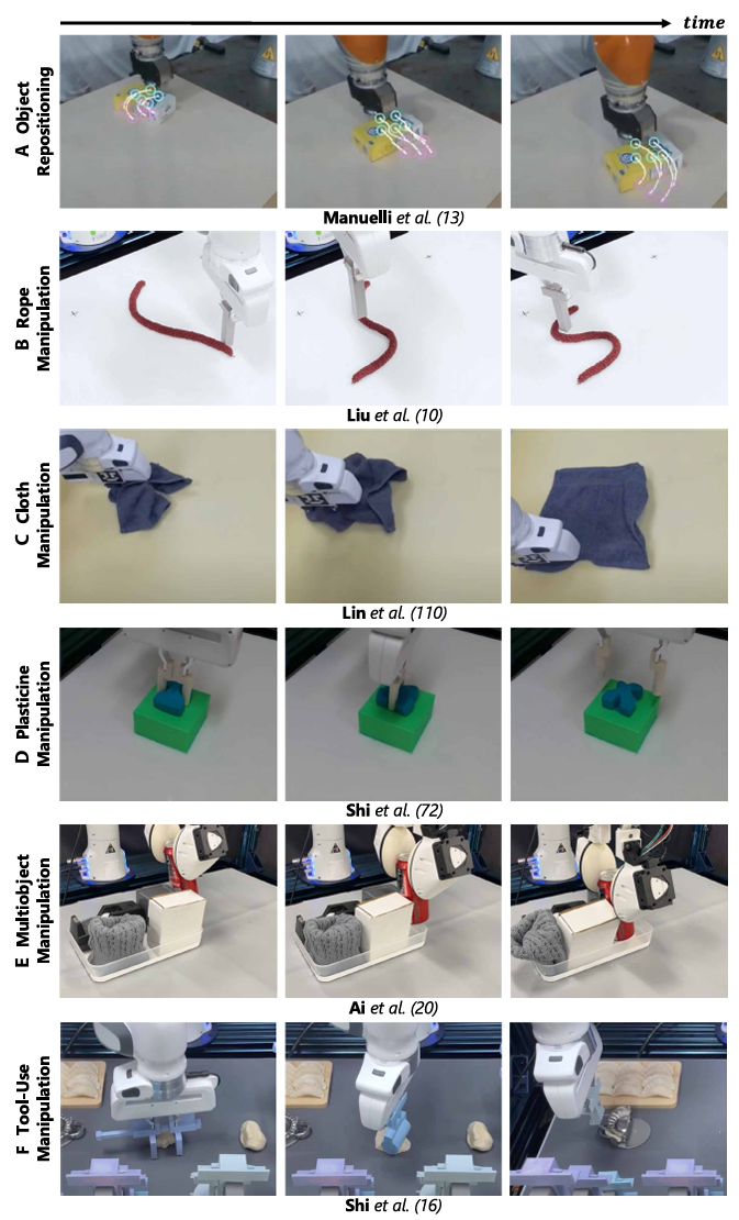 ▲图4|让机器人真正“动起来”的六类操作任务:学习型动力学模型已在多种操作场景中展现出强大能力,包括:(A)物体重定位、(B)绳索操作、(C)布料操作、(D)橡皮泥/塑性体操作、(E)多物体协同操作,以及(F)工具辅助操作。这些例子覆盖了刚体与柔体、单物体与多物体,展示了从“理解物理”到“掌控物理”的全面进步