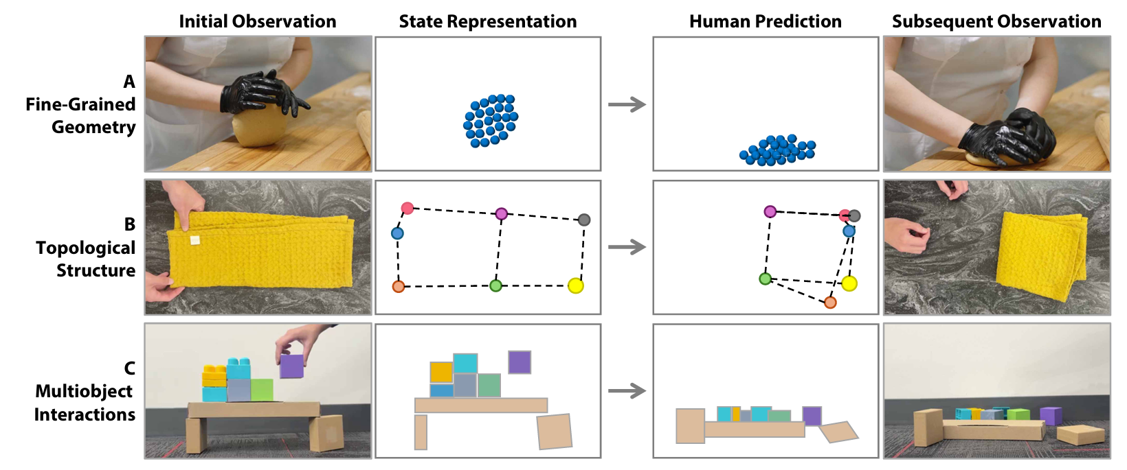 ▲图1|人类在完成复杂操作时,会在脑海中形成不同层次的“物理想象”——比如用粒子去理解几何形状的细节(A),用关键点去把握结构关系(B),或以物体为单位理解多物体之间的交互(C)。学习型动力学模型正是试图让机器人也具备这种“预见结果”的能力,通过结构化状态表示去模拟人类的物理直觉