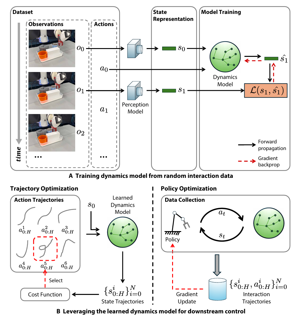 ▲图2|机器人如何通过学习获得“物理预测力”整个流程可以分为两步:(A)机器人首先在交互数据上训练动力学模型,由感知模块从观测中提取状态表示,并以自监督方式学习状态转移;(B)训练好的模型可用于下游控制任务——要么通过评估一系列动作轨迹进行规划,要么生成交互数据供策略学习使用。换句话说,这就是机器人从“看”到“想”,再到“动”的学习闭环