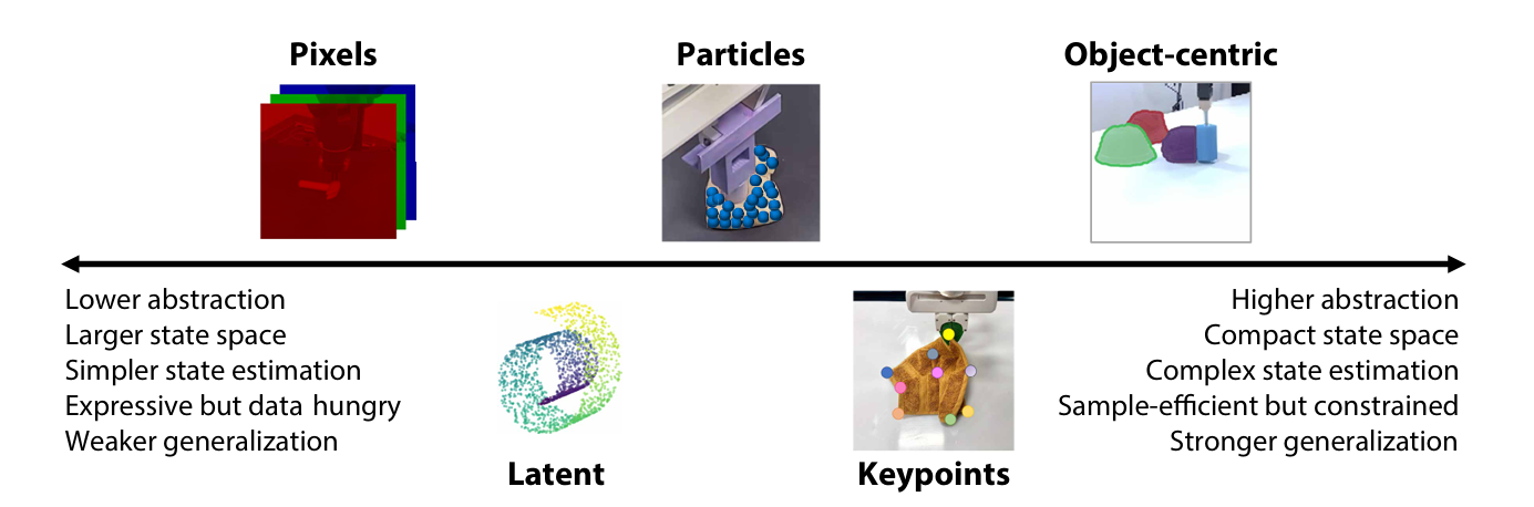▲图3|从像素到物体:不同层次的状态表示。学习型动力学模型可使用从“无结构”到“高结构”的多种表示形式:像素与潜变量对应端到端建模,而粒子、关键点和物体级表示则引入更强的结构先验。结构越强,模型的泛化能力越好,但对状态估计的要求也更高。这幅图形象展示了状态表示的连续谱,从无序像素到具有语义结构的世界建模