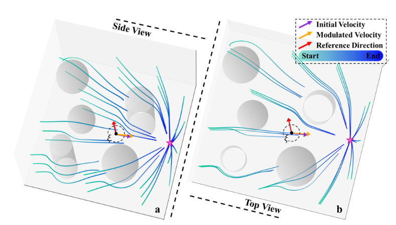 研究团队的灵感来自于调制动力系统(Modulated Dynamical System)。他们让无人机在每次控制迭代中,用一帧LiDAR点云数据计算出一个调制矩阵(modulation matrix),这个矩阵就像一个实时生成的“速度偏转力场”,会把无人机的初始速度修正为远离障碍物的安全方向。