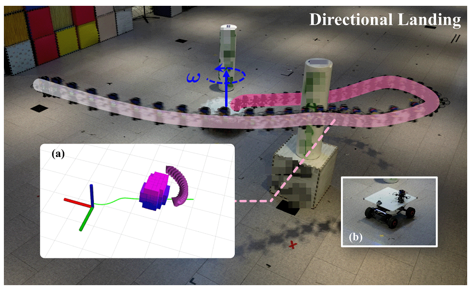 图1|无人机通过 CoNi-OA 算法,在地面车(UGV)的旋转平台上实现精确降落。绿色轨迹为原先规划的安全路径,当平台运动导致路径受阻时,无人机能主动绕开障碍并重新对准着陆方向。(a)为第三人称视角展示避障过程,(b)为成功降落的瞬间