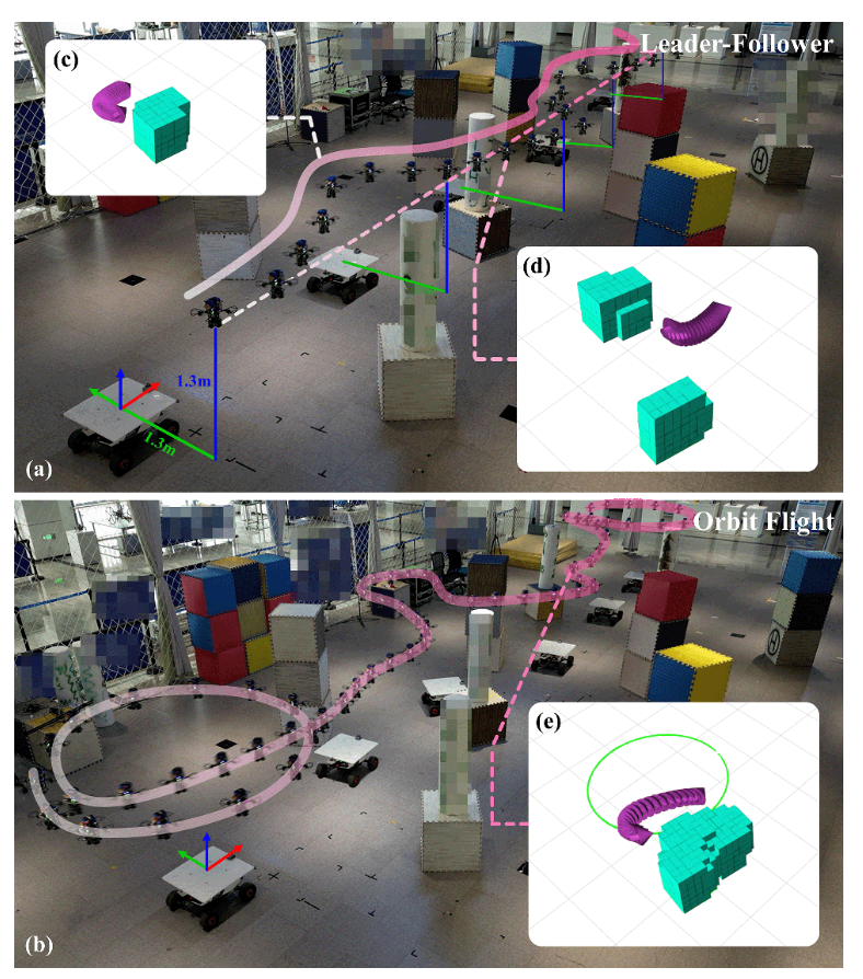 图6|图中展示无人机在两类任务中的表现:(a)为跟随任务,(b) 为环绕飞行任务,(c)-(e) 展示无人机在遭遇障碍时生成的避障轨迹。无论任务类型如何,CoNi-OA 都能使无人机保持稳定、安全的相对运动