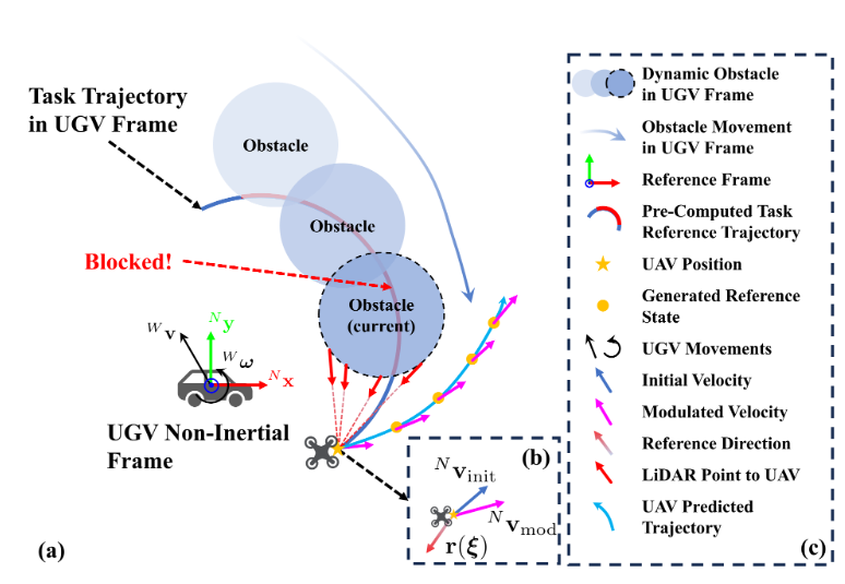 图3|该图展示了 CoNi-OA 如何在非惯性坐标系下为无人机规划安全路径。(a)无人机依据 LiDAR 数据在地车坐标系中计算避障轨迹,即使UGV运动不可预测也能实时调整;(b)通过调制原始速度向量,无人机可生成朝向目标的无碰撞路径;(c)为对应标签说明