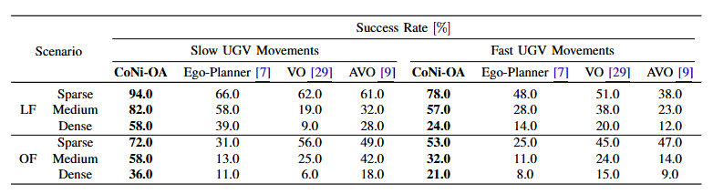 图7|不同算法在多种场景下的避障成功率对比:列出了 CoNi-OA、Ego-Planner、VO 与 AVO 在不同障碍密度及UGV速度条件下的任务成功率(共100次实验)。当无人机始终与障碍保持 0.1 米以上距离视为成功。结果显示 CoNi-OA 在多数场景中均显著领先
