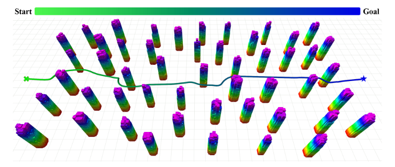 图4|由算法生成的安全飞行轨迹根,路径从起点的绿色逐渐过渡到终点的蓝色,展现了无人机在避障过程中平滑地向目标推进,并可以以非常灵敏的反应速度避开障碍