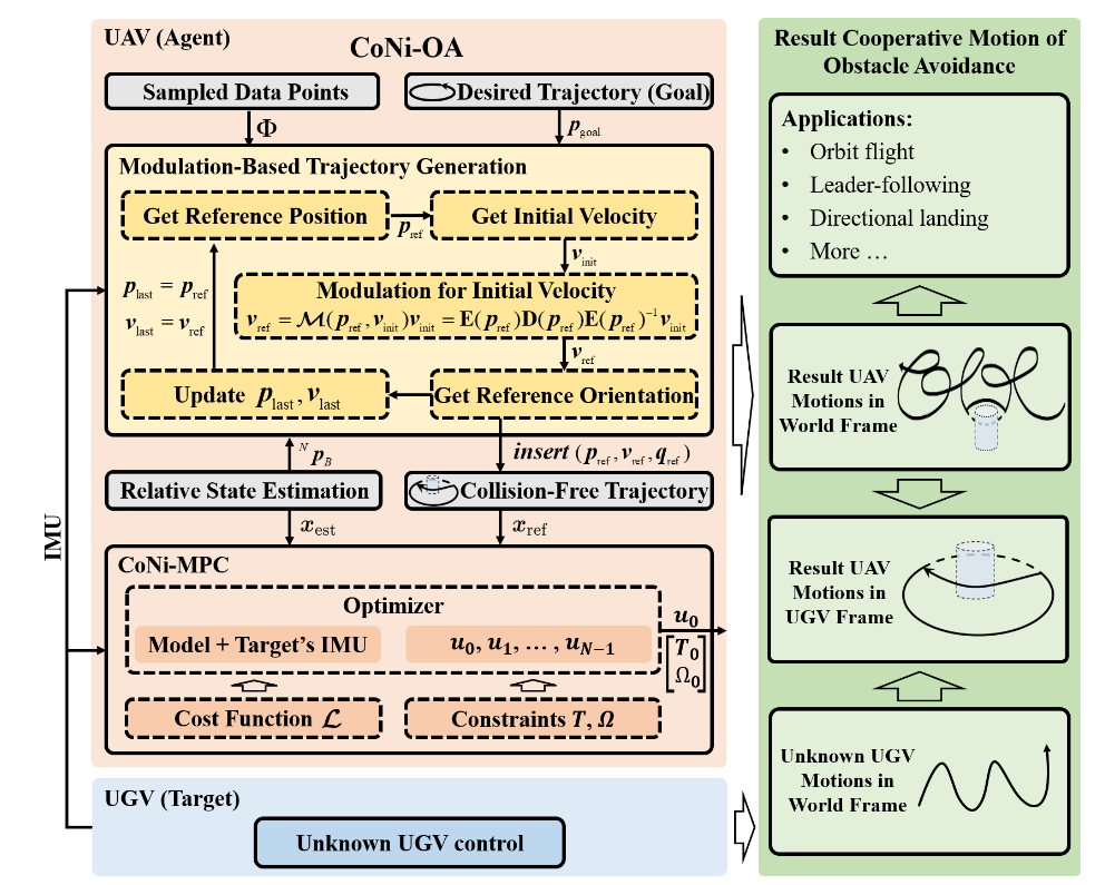 图5|CoNi-OA 的系统框架示意。算法利用无人机的相对位姿与 LiDAR 点云生成局部无碰撞轨迹,并由 CoNi-MPC 控制器实时跟踪,实现空地协作中的自主避障